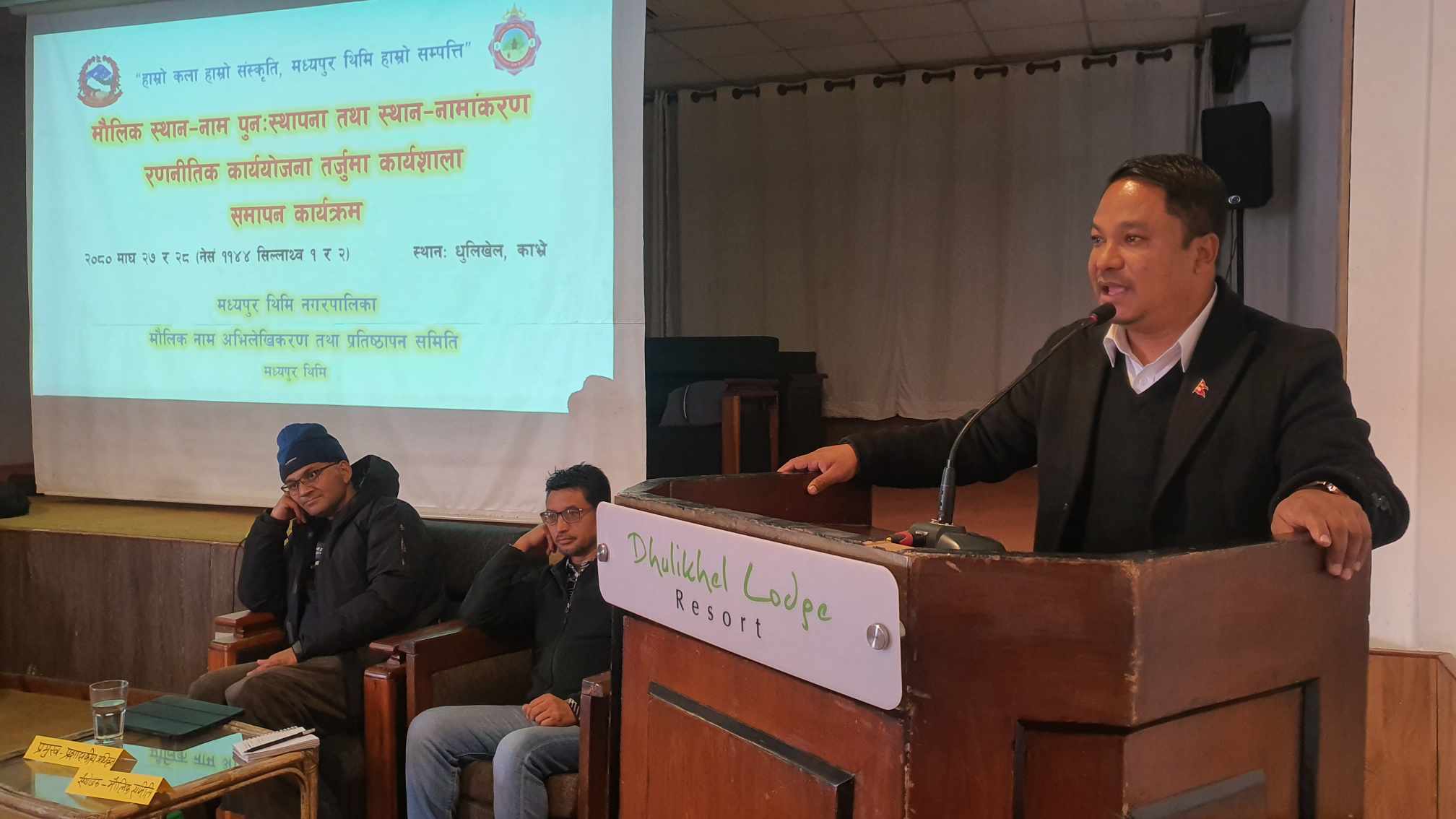 मध्यपुर थिमी नगरपालिका भित्रका मौलिक स्थानका नामहरु यहि बर्ष चैत्र १५ गते भित्र नामपाटी सहित निश्चित मापदण्ड र ढाँचामा पुनःस्थापना गर्ने कार्य योजना पारित गरेको छ । मौलिक स्थान नाम संकलन तथा प्रतिस्थापन समितिको काभ्रेको धुलिखेलमा सम्पन्न २ दिने कार्यशालावाट पुनस्थापना कार्ययोजना पारित भएको हो ।