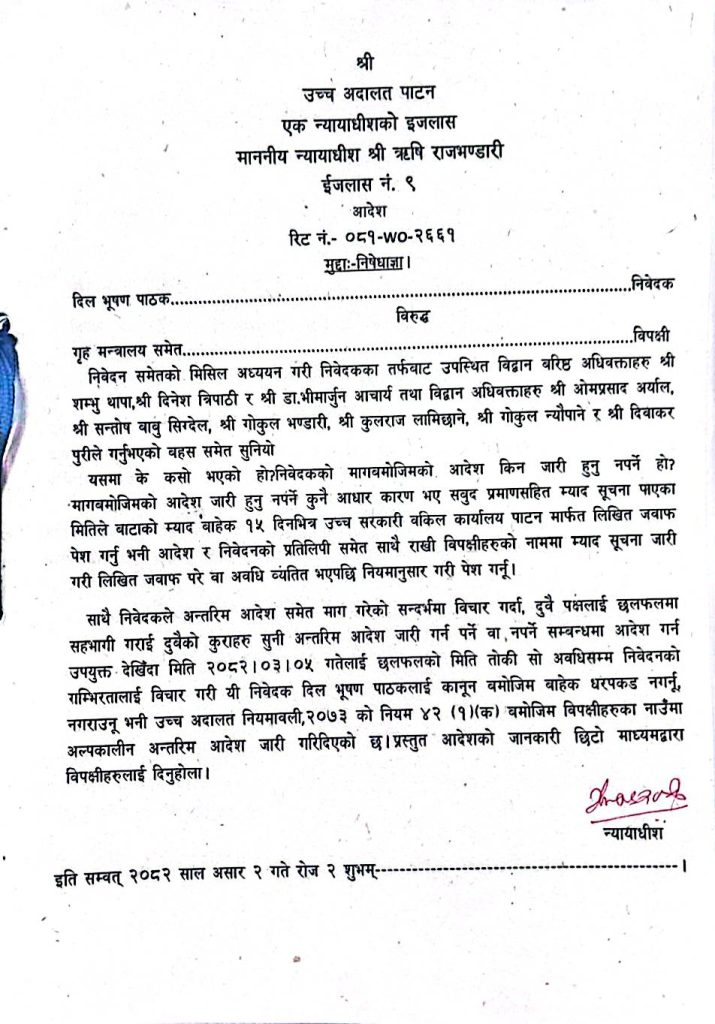 आफूलाई गैरकानूनी रुपमा पक्राउ गर्न खोजिएको भन्दै पत्रकार पाठक उच्च अदालत पाटन पुगेका थिए । प्रारम्भिक सुनुवाइपछि नै उच्च अदालतले उनलाई पक्राउ नगर्न अल्पकालीन आदेश दिएको हो ।