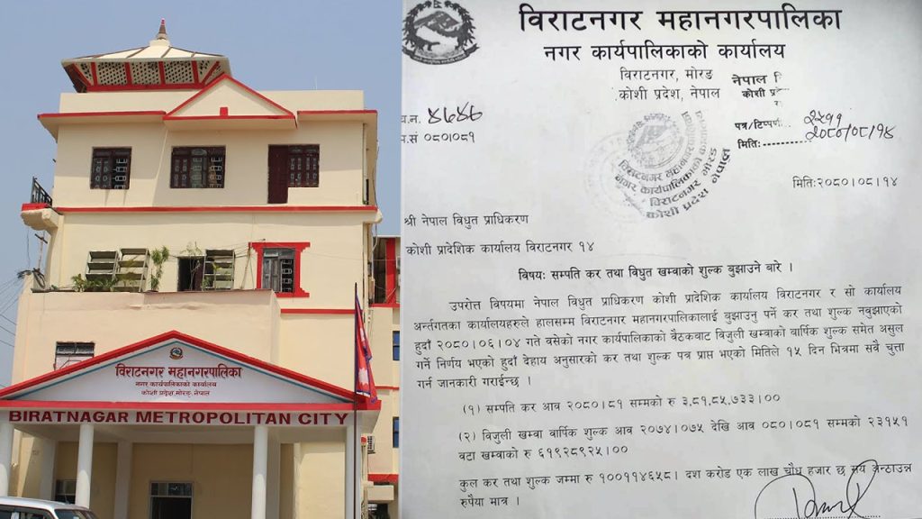 विराटनगर । विराटनगर महानगरपालिका र नेपाल विद्युत प्राधिकरणले एक–अर्कालाई भुक्तानी तिर्न ताकेता गरेका छन् । विद्युत महसुल तिर्न बाँकी रहेको भन्दै विद्युत प्राधिकरणले महानगरपालिकाको तीन वटा वडाका...