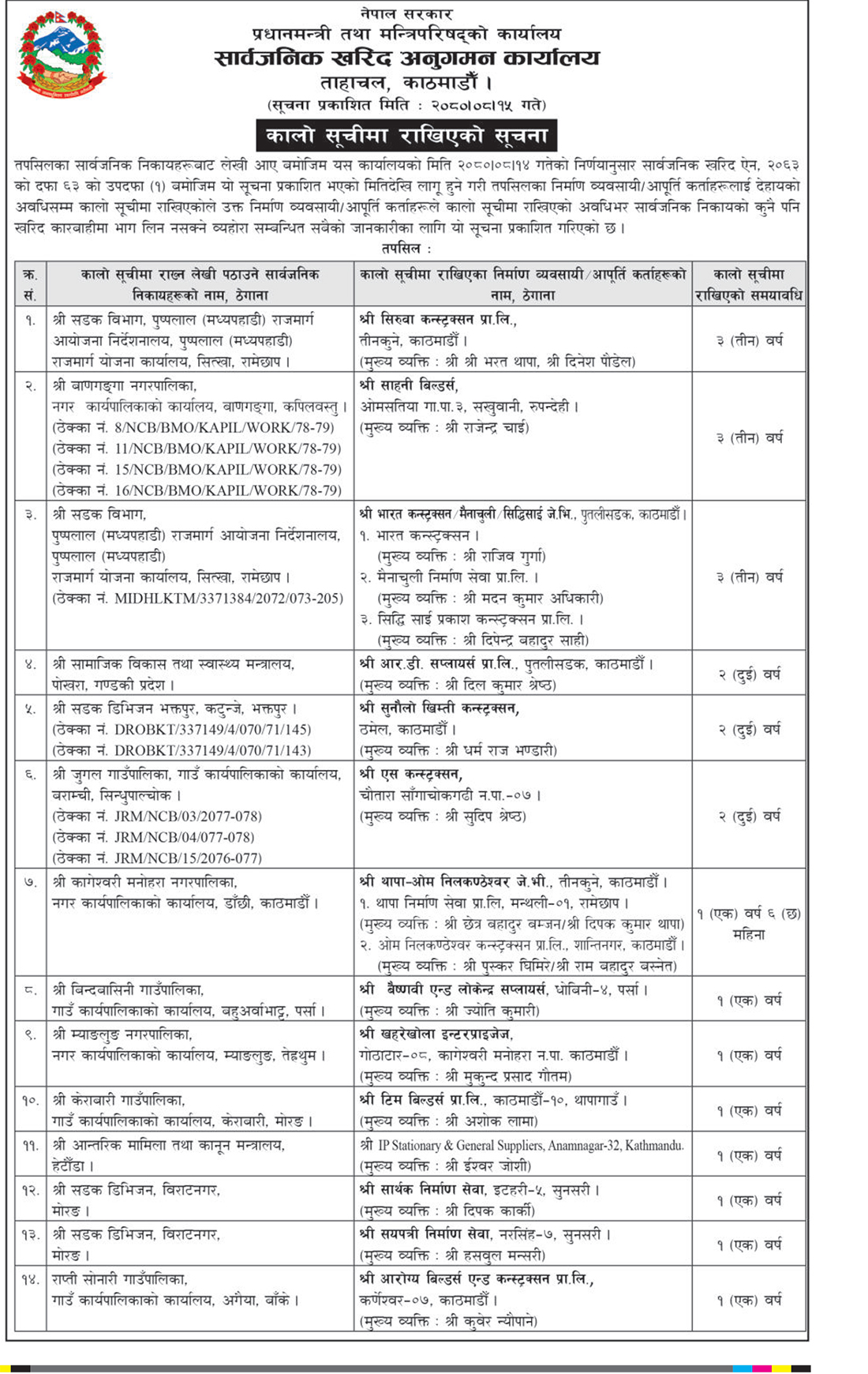 काठमाडौं । सरकारले विभिन्न १४ वटा निर्माण कम्पनीलाई कालोसूचीमा राखेको छ । प्रधानमन्त्री तथा मन्त्रिपरिषद्को कार्यालय अन्तर्गत सार्वजनिक खरिद अनुगमन कार्यालय ताहाचलले १४ वटा कम्पनीलाई एकदेखि तीन वर्षका लागि कालोसूचीमा राखेको हो ।
